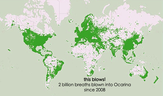 Ocarina transforms the iPhone into an ancient flute-like instrument that responds to your breath, touch, and movements. Created in 2008, it was one of the very first mobile/social musical instruments; its globe visualizes where people are playing Ocarina and even lets users listen in on each other. It went on to be one of Apple's Hall of Fame apps and currently has more than 10 millions of users, who have since 2008 expended 2 billion breathes blowing into their iPhones (see map below) and have listened to each other 47 millions times in the globe! The vision was and remains to bring the joy of music-making to as many people as possible, and to connect the world more through music (with a little help from technology).
